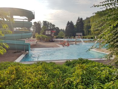 Erfrischende Abkühlung und viel Spaß auf der Mega-Rutsche verspricht das Freizeit- und Familienbad direkt am Waldrand gelegen.